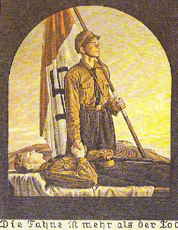 The source: Helmut Stellrecht, Glauben und Handeln. Ein Bekenntnis der jungen Nation (Berlin: Zentralverlag der NSDAP., Franz Eher Nachf., 1943). Birth and Death Birth and death are the same; they are the two sides of one door. To enter one room always means leaving another. It depends on which room or which life we are in as to whether we say “entrance” or “exit,” life or death. For he who understands it, death holds no terrors. But he who did not go his proper way in life and sinned will see his guilt in death. But there is after death no place of torture, no hell. To see one’s guilt is the severest judgment and at the same time the greatest penalty. Judgment and punishment are within yourself. Neglected work can only be made up by double effort. It will once more be your choice, either to work toward the world plan, or to be its enemy. That is the only death that there is, to become a force for destruction rather than for creation, and this death is not physical. It is your free choice to decide on which side you belong, on god’s or, to use an old term, “the devil’s.” What we call birth and death is only the door between two worlds. There is no birth and no death, only change, and we can go confidently through the door, for all the worlds were created by one hand. ![]() Nature The divine is powerful in its creatures. It dwells not in walls that people build. They may be witnesses of its will, but god is in the living. Our ancestors went into the forests to find or to honor god. They greeted his light rising in the morning. That was more to them than a lamp in a man’s hand. They stood on mountain tops because his greatest work, the starry sky, was nearest there, not covered by a roof of stone. The great spring flowing from the mountain was more genuine and nearer to god than anything that could flow from a bottle held by a human hand. Who dares to say that they were not close to the living god? Other peoples may seek refuge in the stone walls of their cities or seek their god in caves. The true German senses god with holy fear in the life of creation. He prays to god by honoring his great works. Who dares to say that God is nearer to us in that which human beings have built? The faith of our fathers remains strong in us. Still today the German wanders through his countryside and is moved by the beauty of the land god has given him. The summits of his mountains give freedom. He feels eternity amidst the sea. Flowing water is to him the image of eternal change. He protects the forest and the tree and the bush as if they were his comrades. He loves the animals that are tortured and tormented in other countries. What to him is part of his household is elsewhere only a possession. He sees and honors in everything god’s creation, in the holy earth, in the wandering wind, in the flickering flames, in which there is always change. Ever again we stand on the summits of the peaks and wave the torch and feel the magnificent and the ineffable. Who dares chide us because our eyes are open? ![]() Our banner flutters before us! In future we take man for man. We march for Hitler, by night and by necessity, With the flag of the youth, For freedom and bread. Our banner flutters before us! Our banner is a new era. And the flag will lead us into eternity! Yes, our banner means more to us than death!